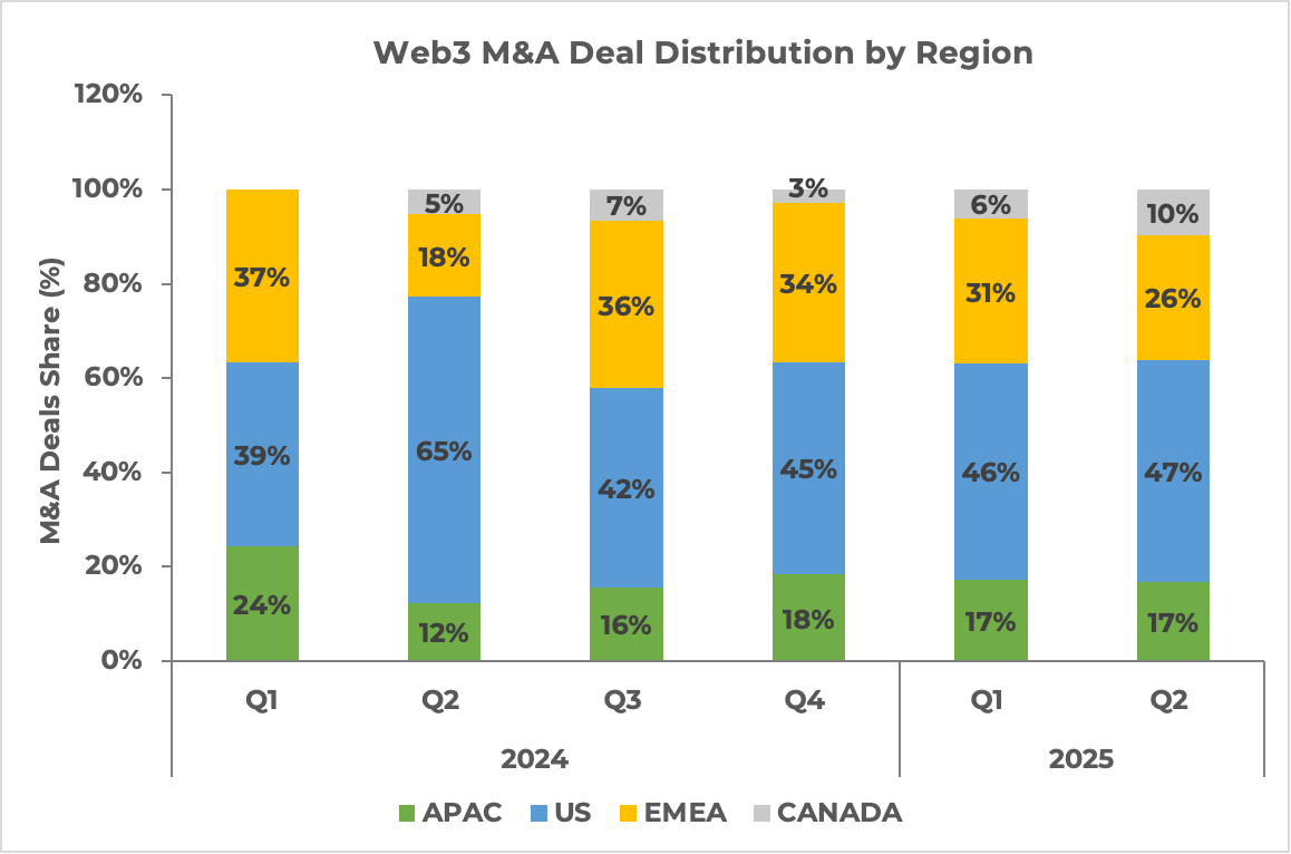 The chart shows the regional distribution of Web3 M&A deals from Q1 2024 to Q2 2025. The US consistently led in deal share, peaking at 65% in Q2 2024 and staying strong at 47% by Q2 2025. EMEA’s share fluctuated throughout the period, reflecting an uneven pace of activity across the region. APAC saw a gradual decline from 24% to 17%, while Canada’s presence, though small, grew steadily to 10%.