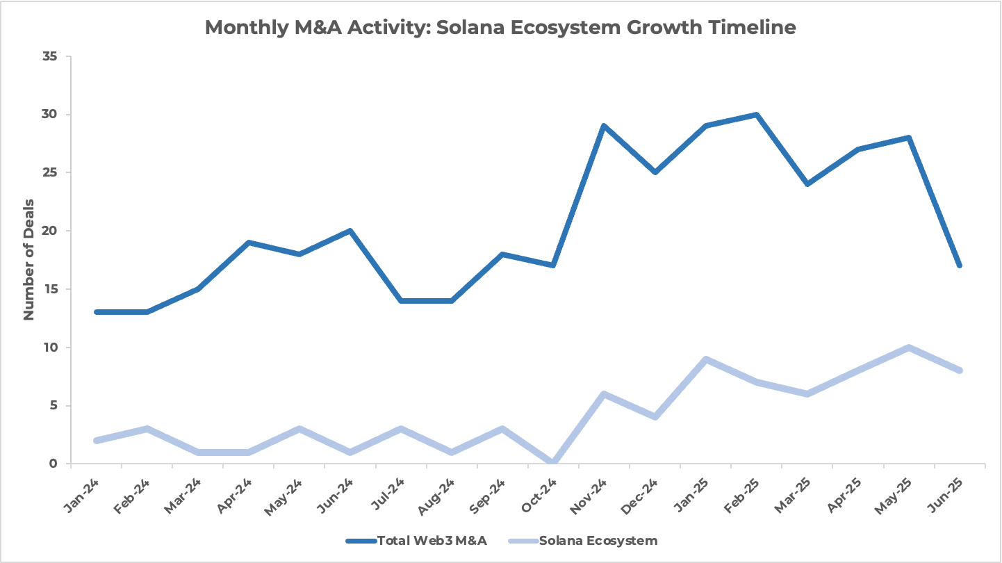 What's particularly striking is that this isn't just seasonal variation—the growth appears sustained rather than cyclical. If the current trajectory continues, 2025 could see Solana ecosystem deals reaching 25-30% of the total Web3 M&A market by year-end.