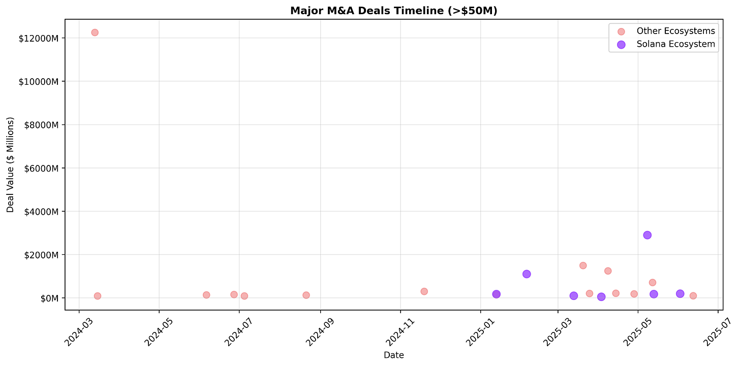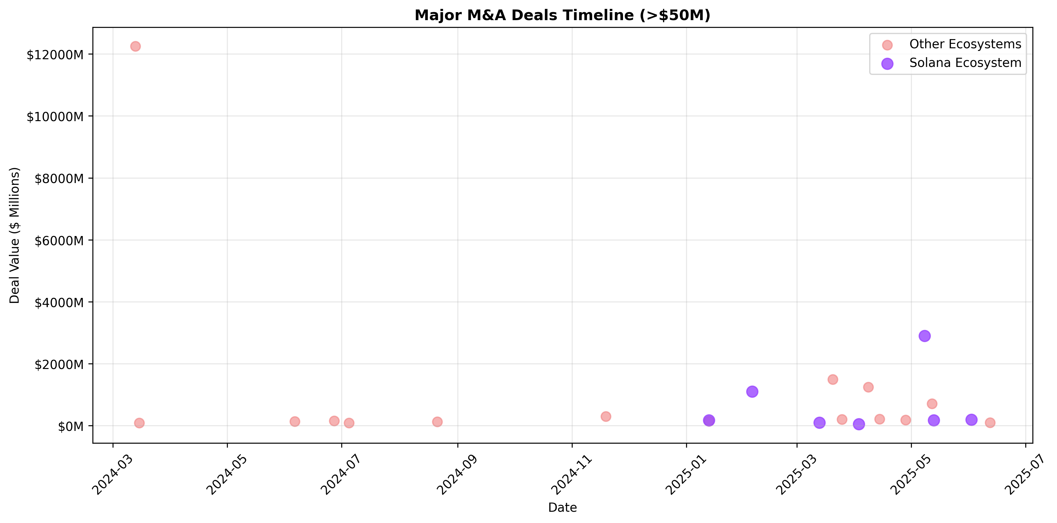 The monthly timeline reveals an unmistakable acceleration pattern. Through most of 2024, Solana ecosystem deals were averaging 2-3 per month. But starting in late 2024, something shifted. By early 2025, we're seeing months with 8-10 Solana deals, representing a clear inflection point in acquisition activity.