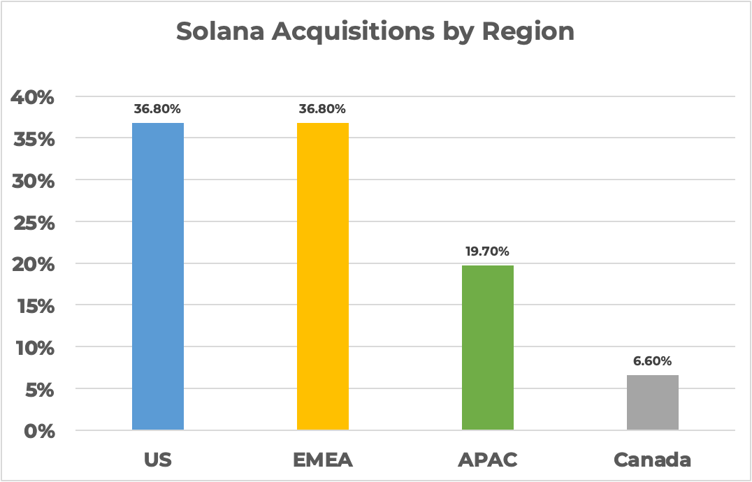 The US-EMEA split being exactly even suggests this isn't just Silicon Valley enthusiasm. European/UAE companies are acquiring Solana teams at the same rate as American ones, which indicates broader international recognition of the technology and teams.
